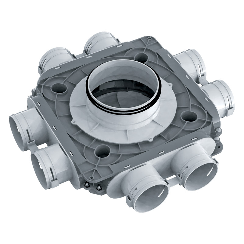 Műanyag légelosztó doboz hátsó csatlakozással. (160 mm/8x75 mm) Blaufast légcsatorna rendszerrel kompatibilis.