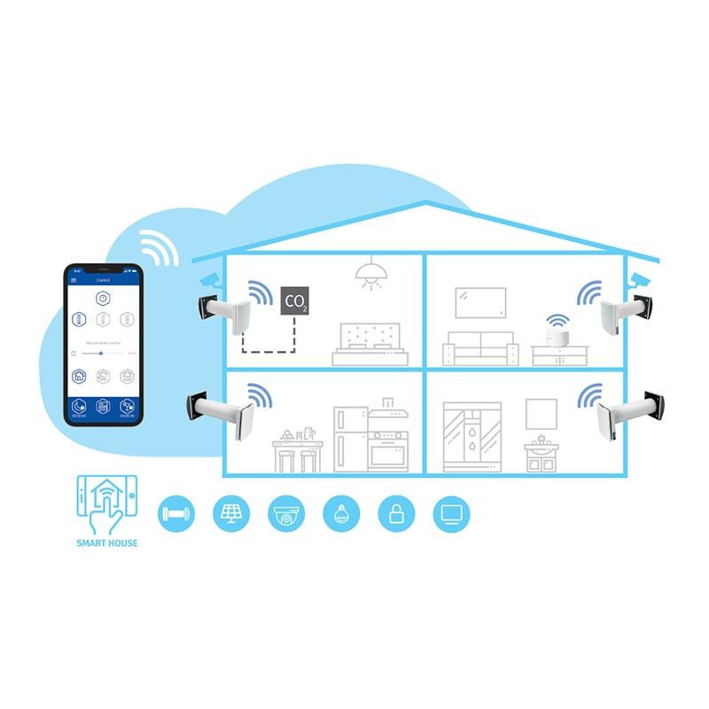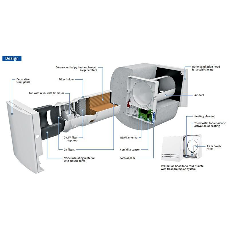 A kerámia hőcserélő akár 90%-os hatásfokkal is működhet, így a beltér hőmérséklete stabil marad, még intenzív légcsere mellett is. A háromfokozatú EC motor (15 m³/h – 30 m³/h – 50 m³/h) lehetővé teszi a teljesítmény rugalmas beállítását, míg a 70 másodperces befúvás–elszívás ciklus váltakozása folyamatos légcserét eredményez, különösen akkor, ha két készüléket párban alkalmazunk.