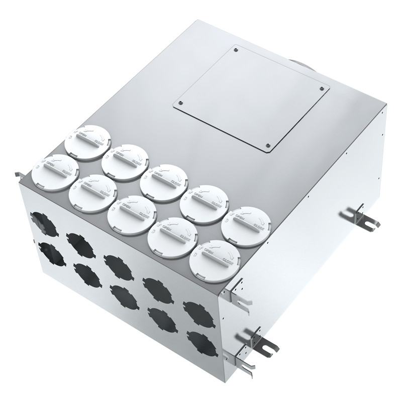 Blaufast légelosztó doboz, 75 mm átmérőhöz, 10 csőcsonkkal.