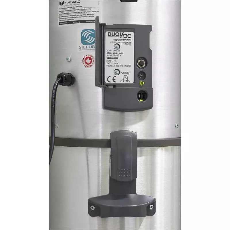 A festett acél és a szálcsiszolt alumínium kombinációja fényűző megjelenést kölcsönöz a központi porszívó berendezésnek.