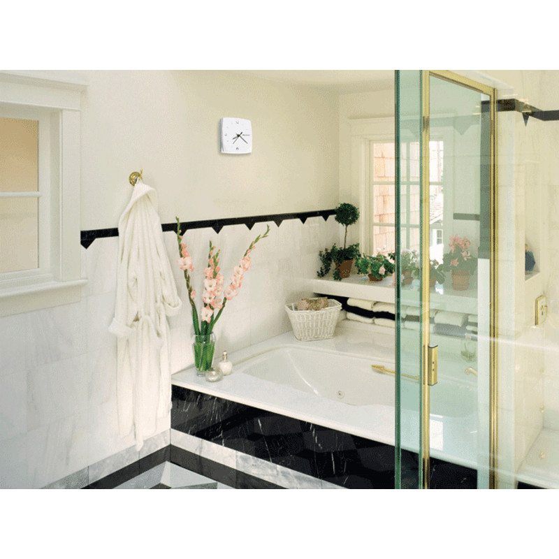 Páraérzékelővel, időzítővel és órával ellátott, dekor előlapos ventilátor wc-k, fürdőszobák és egyéb helyiségek szellőztetésére.