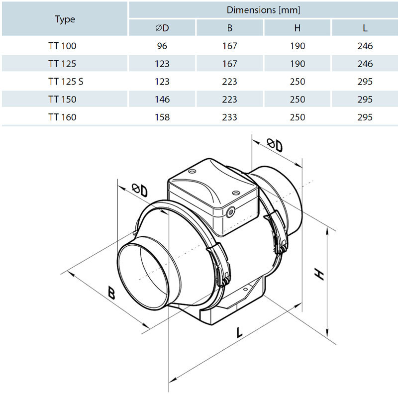 A Vents TT ventilátorok az axiális és centrifugális ventilátorok széleskörű alkalmazhatóságát és nagy teljesítményét ötvözik, és kifejezetten olyan befúvó és elszívó szellőztetési rendszerekhez lettek tervezve, ahol nagy nyomás, erős légszállítás és alacsony zajszint szükséges. A ventilátorok 100-160 mm átmérőjű kör légcsatornákkal kompatibilisek. A VENTS TT ventilátorokra épülő elszívó rendszerek ideális megoldást jelentenek fürdőszobák, konyhák és egyéb párás helyiségek szellőztetésére, valamint lakások, családi házak, üzletek, kávézók stb. levegőcseréjére.