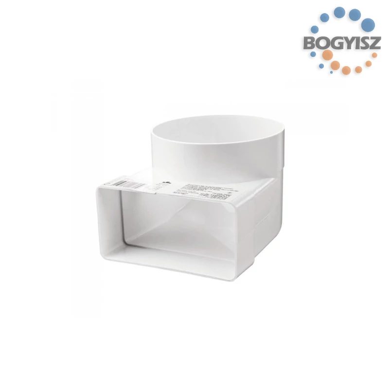 Fehér PVC-ből készült, befúváshoz és elszíváshoz használt légtechnikai elem. Műanyag átalakító idom, könyök, rövid csonkú, idomcsatlakozós, 55x110 mm átmérő, 100 mm keresztmetszet.