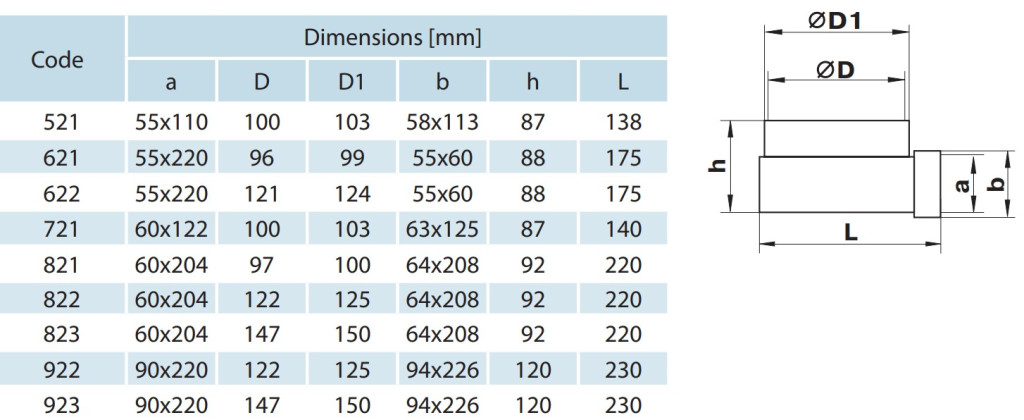 Az idom fehér műanyagból készül, amely könnyű, tartós és korrózióálló megoldást biztosít. A lapos légcsatornák közvetlenül csatlakoztathatók, míg a kör keresztmetszetű csövek megfelelő átalakító csatlakozóval illeszthetők a rendszerhez.