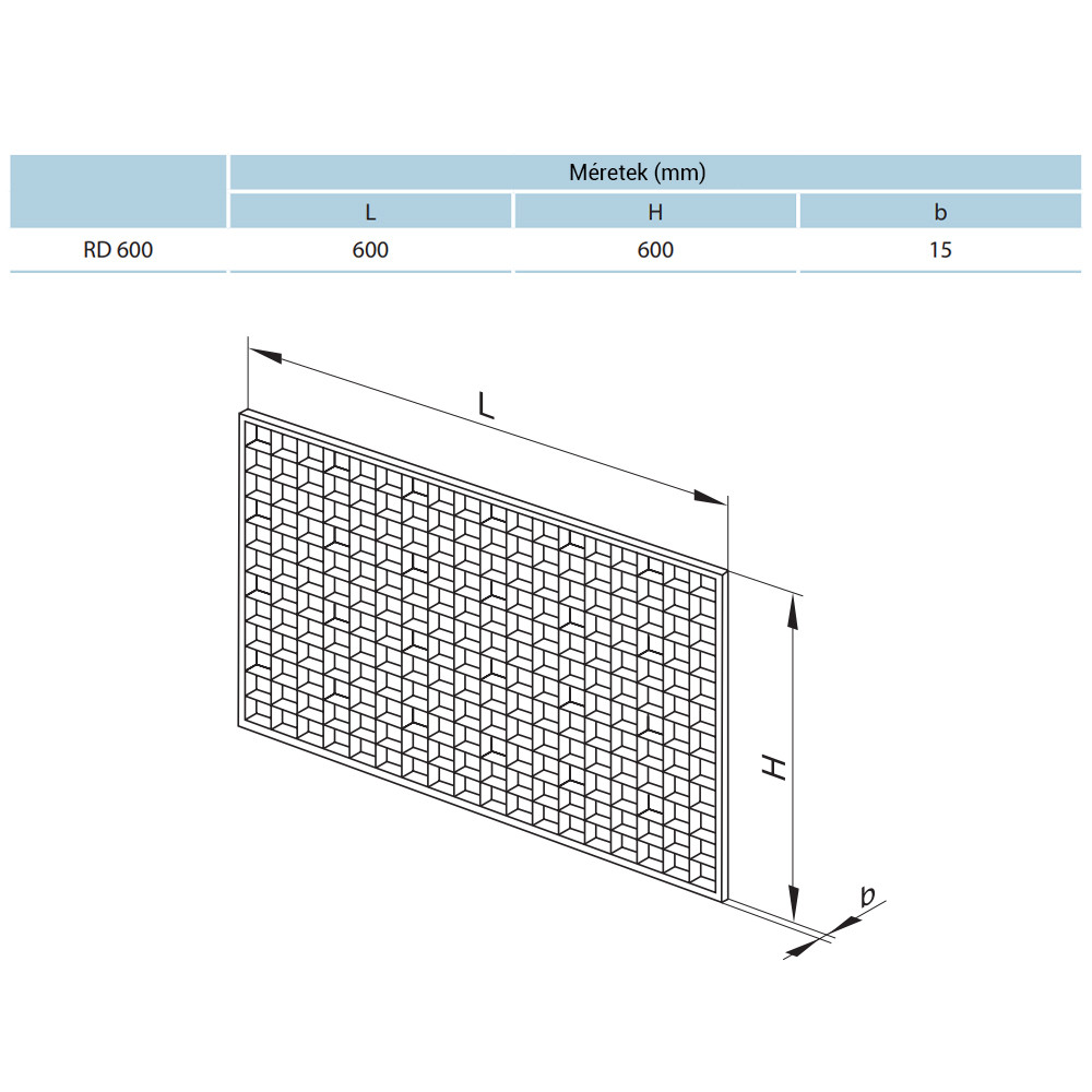 Álmennyezetbe szerelhető szellőzőrács, 600x600 mm.