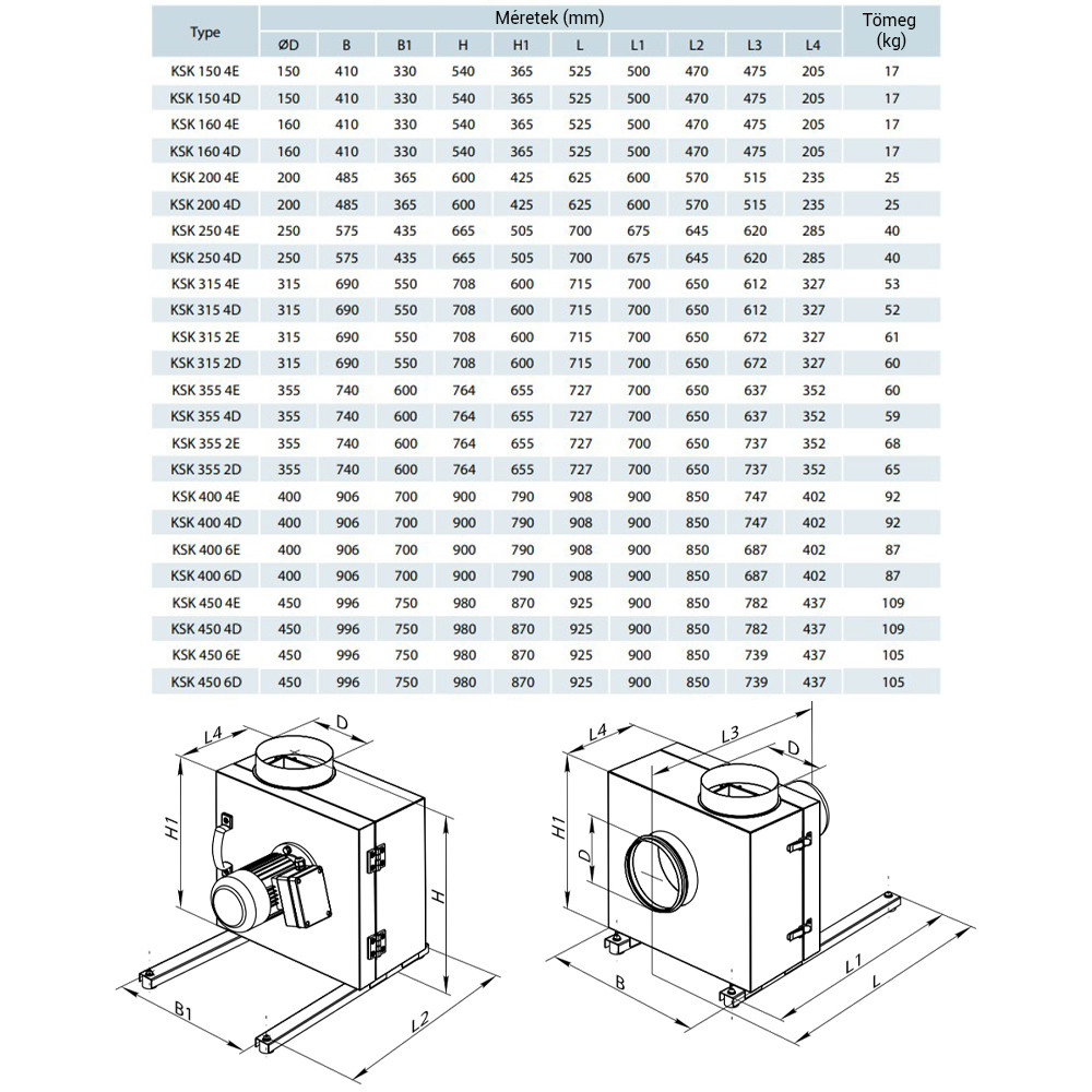 Nagy megbízhatóságú egyfázisú vagy háromfázisú, kalickás forgórészű motorral szerelt, nagy teljesítményű centrifugál ventilátor, előrehajló lapátokkal (150-250 mm méretig) vagy hátrahajló lapátokkal (315-450 mm méretben).