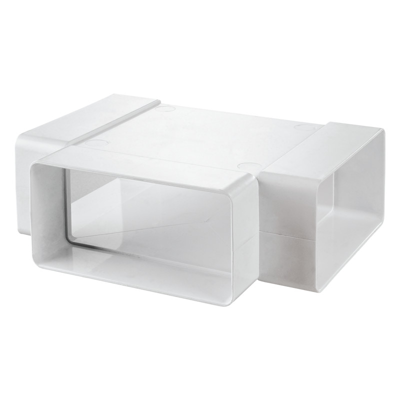 Fehér PVC-ből készült, műanyag T idom, azonos méretű szögletes lapos légcsatornához.