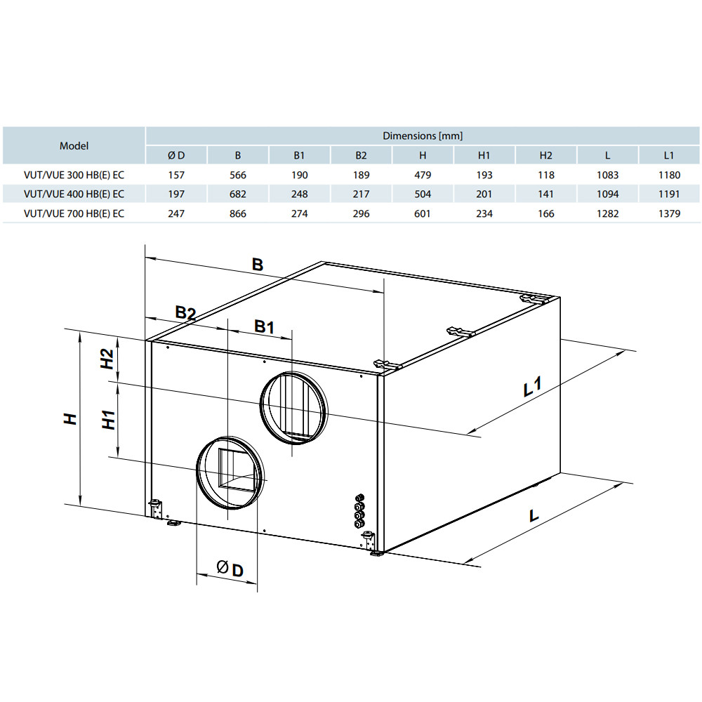 A VUT/VUE HB EC és VUT/VUE HBE EC légkezelő egységek teljes funkcionalitású szellőztető berendezések, amelyek biztosítják a levegő szűrését, a friss levegő befújását és az elhasznált levegő elszívását.